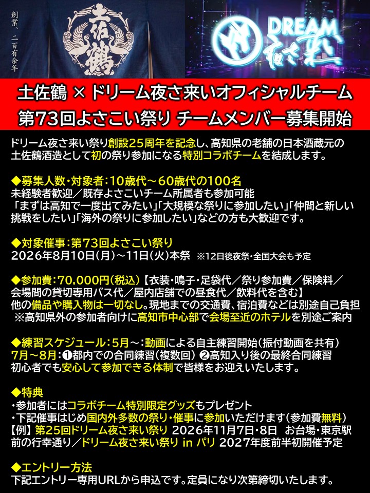 第73回よさこい祭り チームメンバー募集開始(2026年3月1日)
