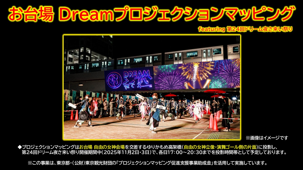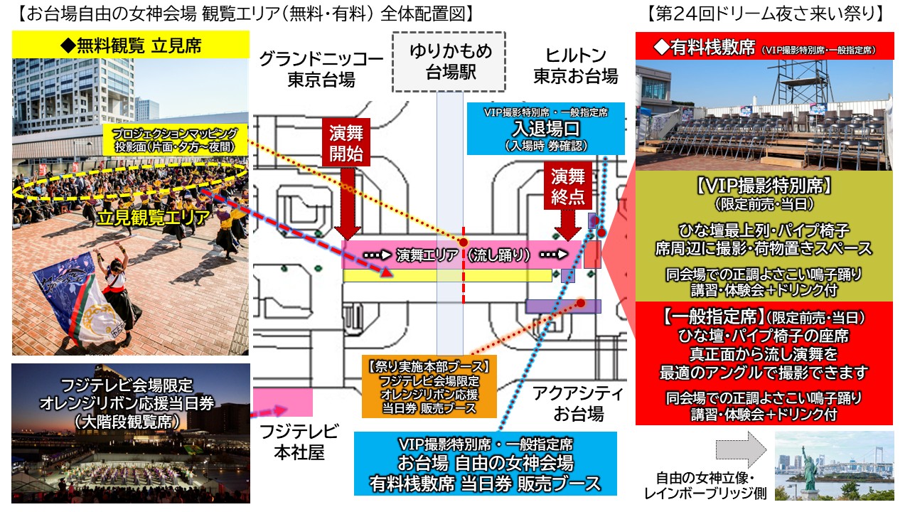 <お台場 自由の女神会場 特別桟敷席チケット販売開始!夕方~夜間には「お台場Dreamプロジェクションマッピングとコラボした迫力かつ華麗なよさこい演舞のデジタルパレード、史上初の歌舞伎×アニメ×祭りをテーマにしたホログラムショーもみどころ!>